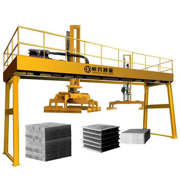 三興龍門式磚板分離機可將不同型號磚機生產的不同規格的砌塊進行磚板分離碼垛,碼好后用叉車整垛運到堆場養護,也可配合叉車抱夾實現無托盤碼垛并可直接抱磚裝車,大大節省了人工成本。
